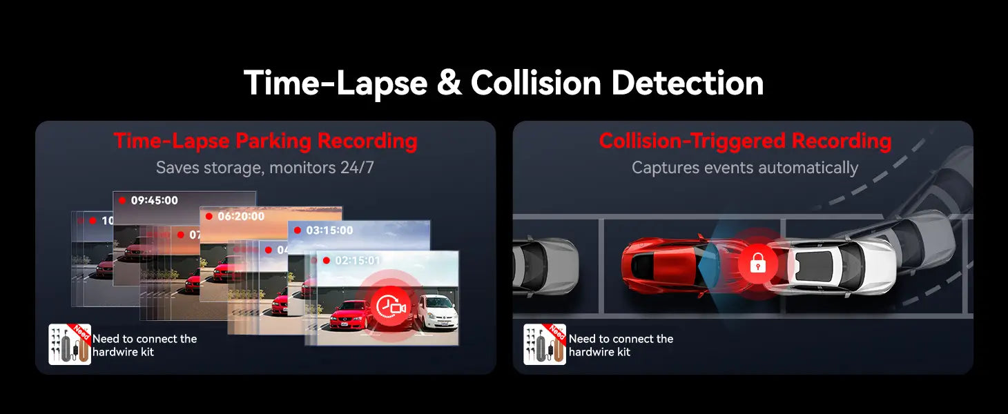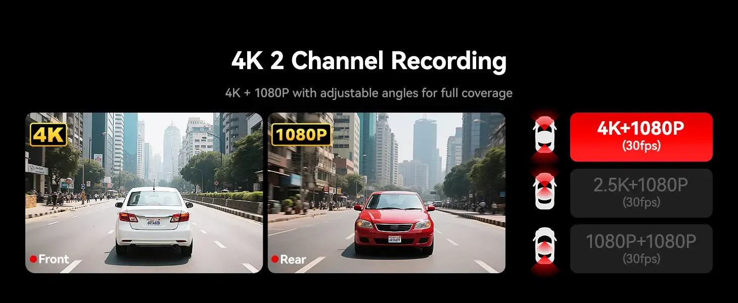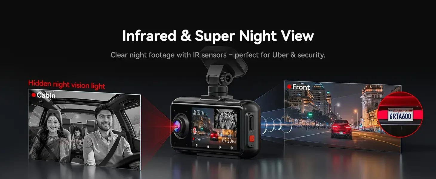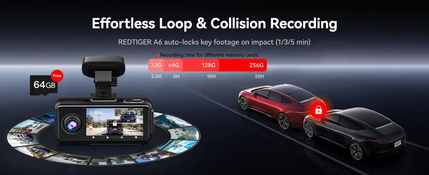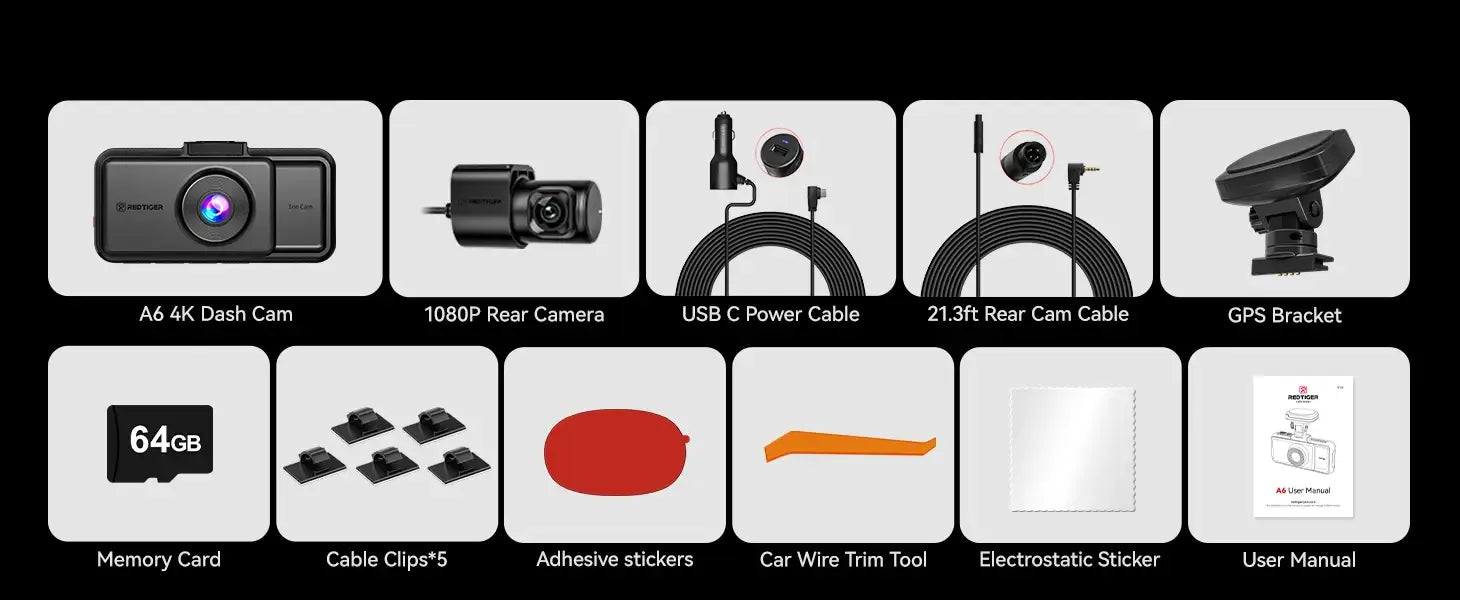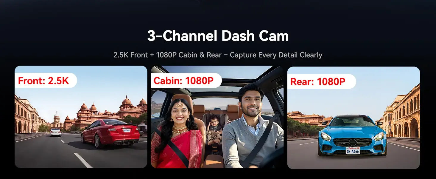- A6:3-Channel (2.5K Front Touch Screen Dash Cam+ 1080p In-Car Rear Camera+ 1080P Cabin)+ 64GB SD Card+24-Months Extended Warranty