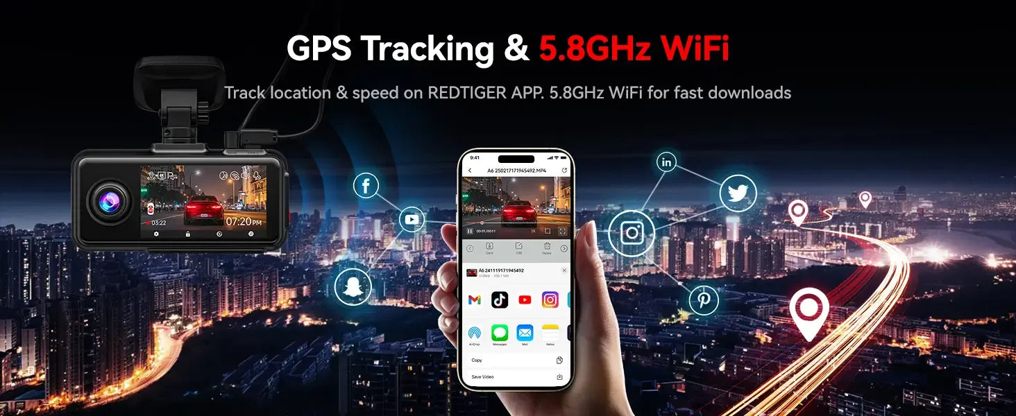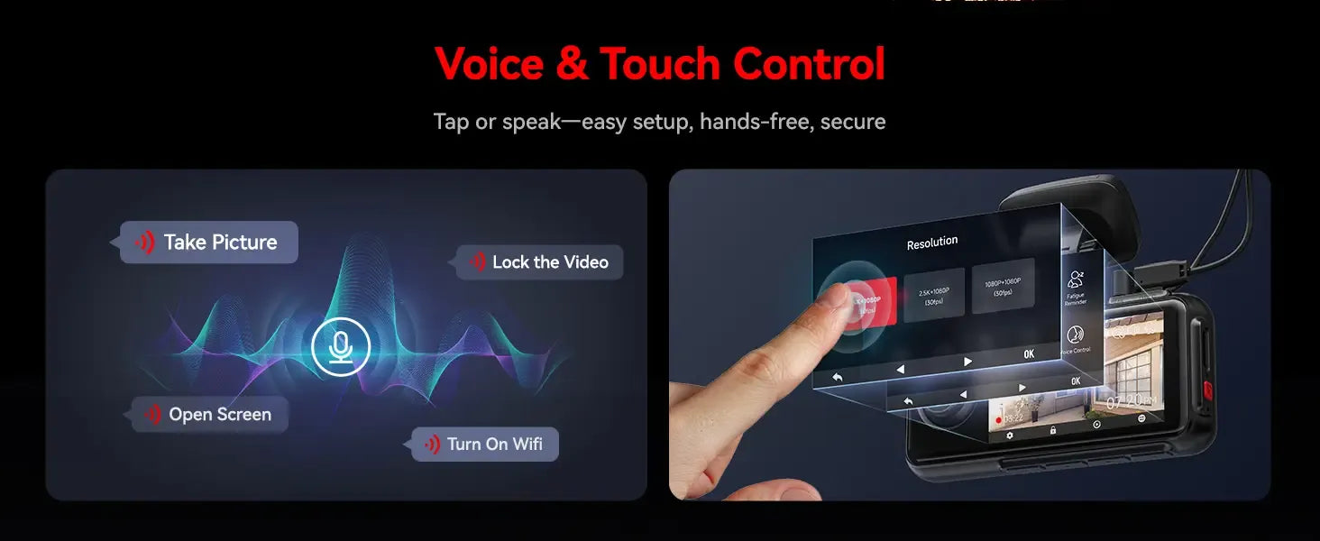 - Voice Control, Touch Screen, 24/7 Parking Monitoring, 5.8GHz WiFi & App control, GPS Tracking, Super Night View, and Loop Recording!