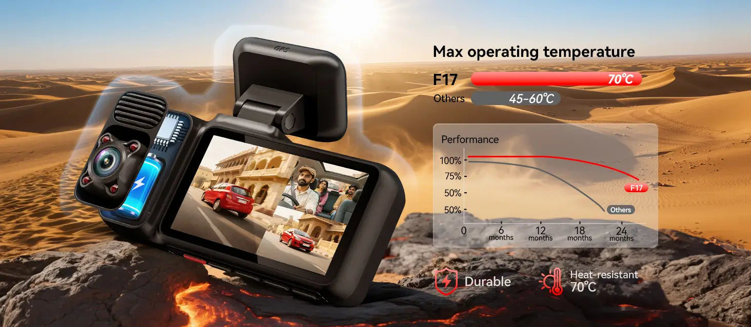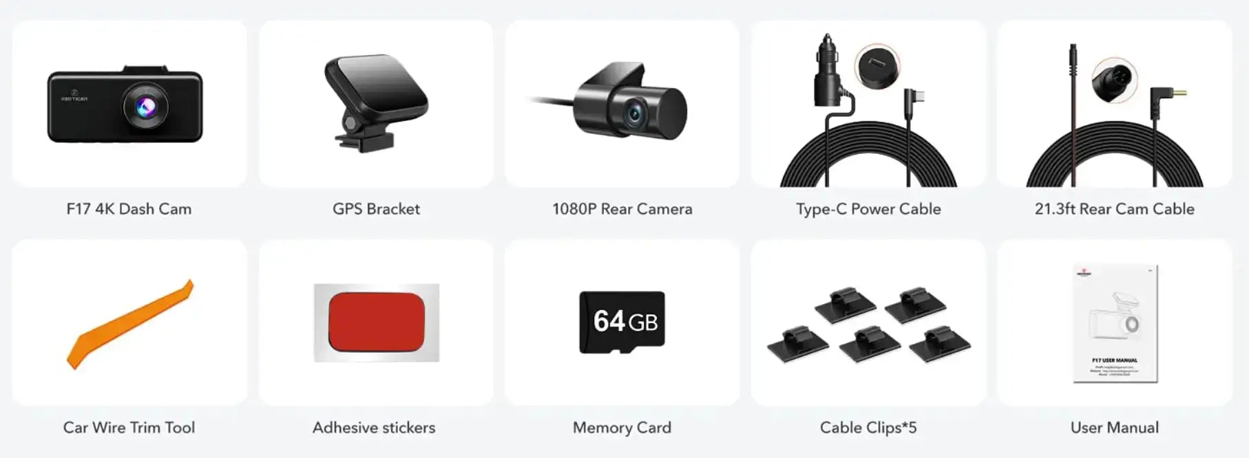 - F17: 4K Front & IR Night View Cabin + 1080P Incar Rear camera + 64GB SD Card + 18-Months Warranty.