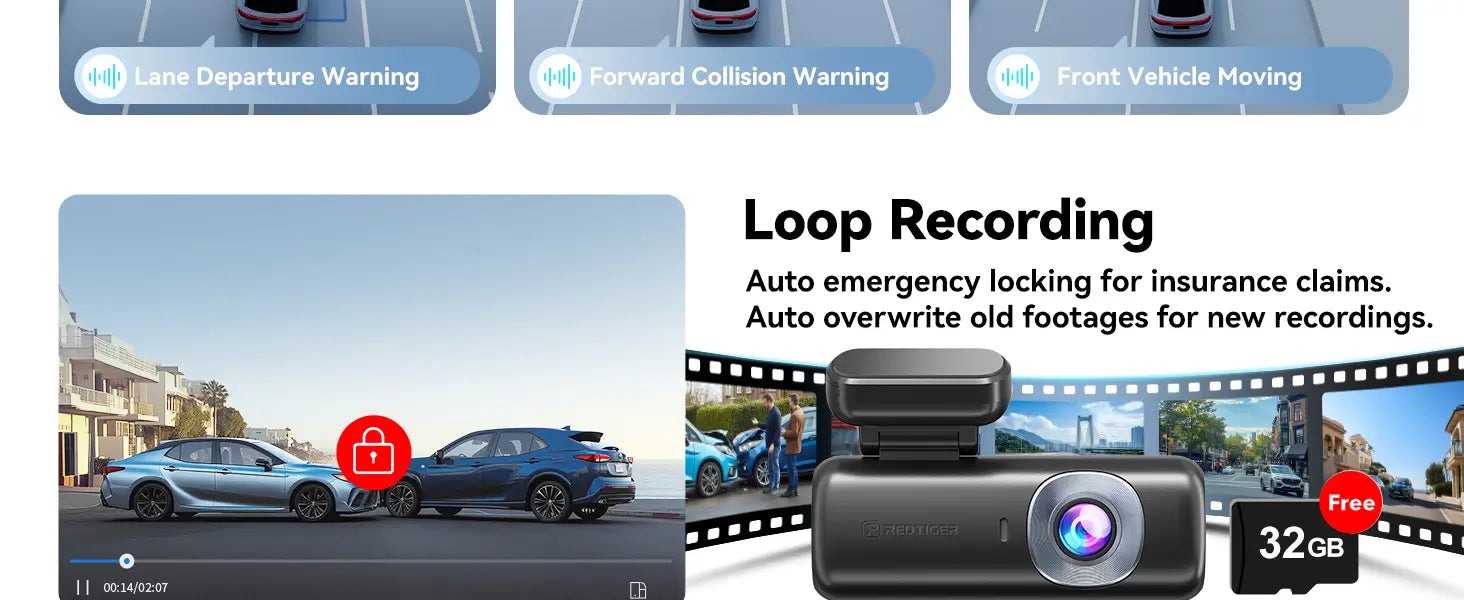 - Equipped with F1.8 aperture, a wide field of view at 105° wide angle, records detailed footage on the road with 32GB SD Card.