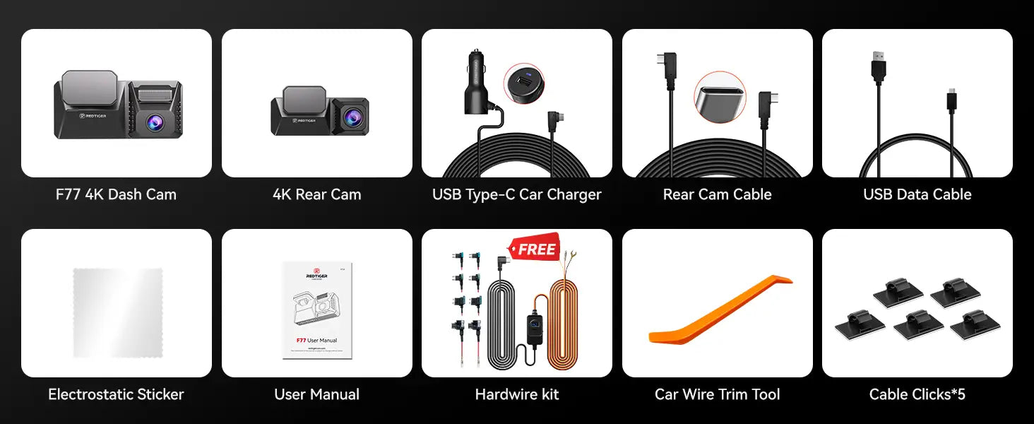 The F77 host can use the power cable of other models of redtiger dashcams (such as F7N series products), but their rear cameras are not compatible. This means that if you directly replace the originally installed dashcam with F77, the 4K rear camera will not be available. We recommend that you re-arrange the cables.