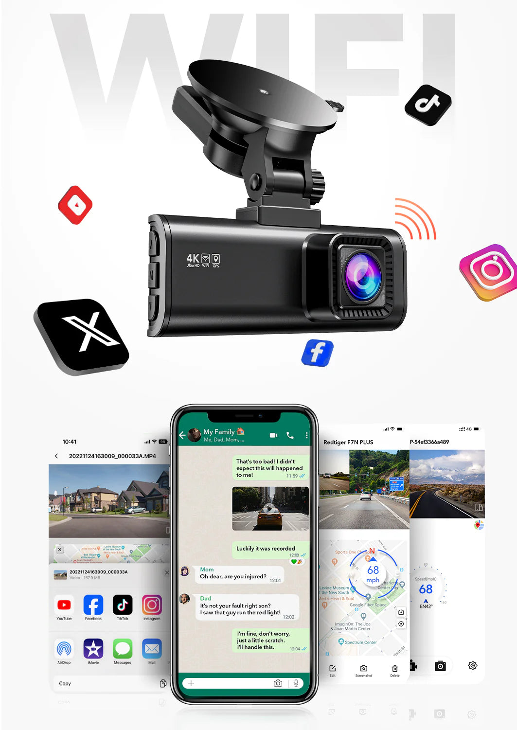 Featuring 4K lens security camera, F7N is able to capture all clear images, including license plates, road signs and conditions.
